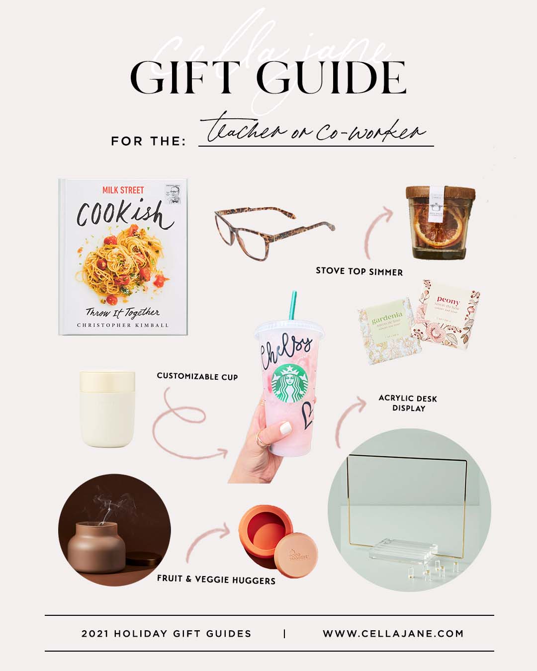 Cooking Book // Blue light glasses // Stove Top simmer // Porter to-go cup // Customizable cup // Soap bars // Candle // Fruit & Veggies Huggers // Acrylic Display