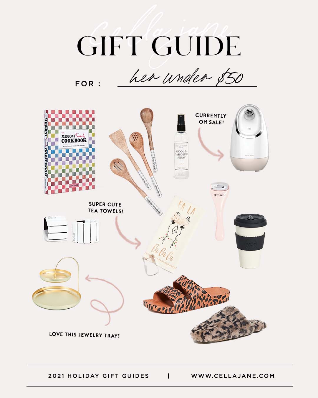 Cookbook // Ankle weights // Utensils // Wool & Cashmere spray // Steamer // Tea towels // Jewelry tray // Slippers // Sandals // Face roller // Coffee mug