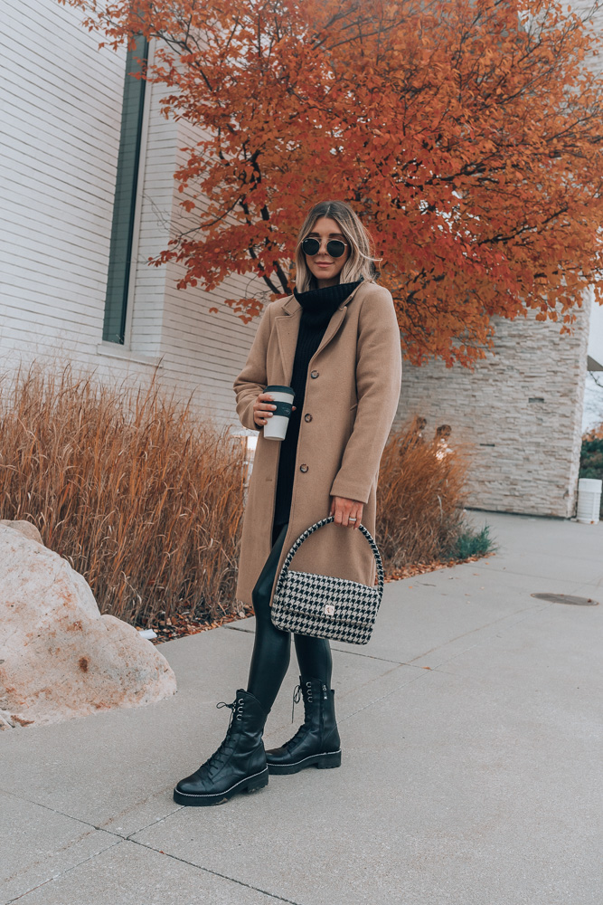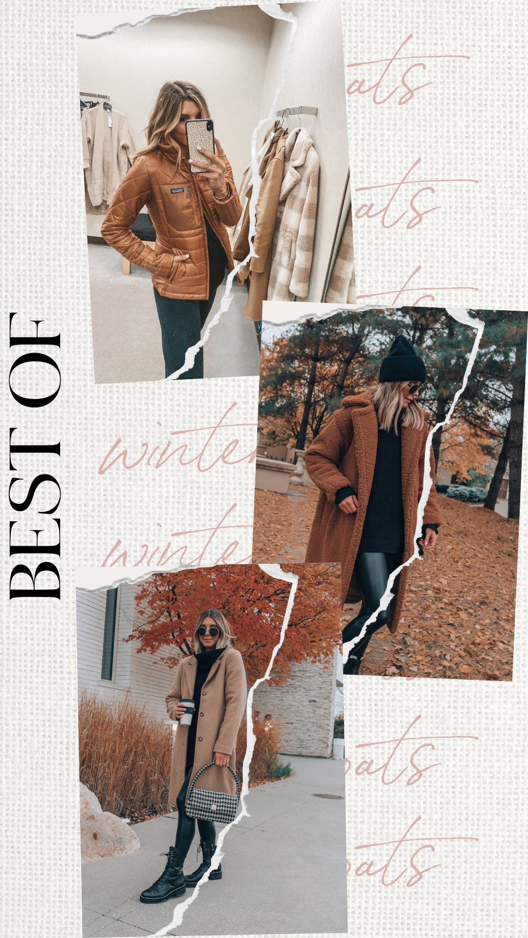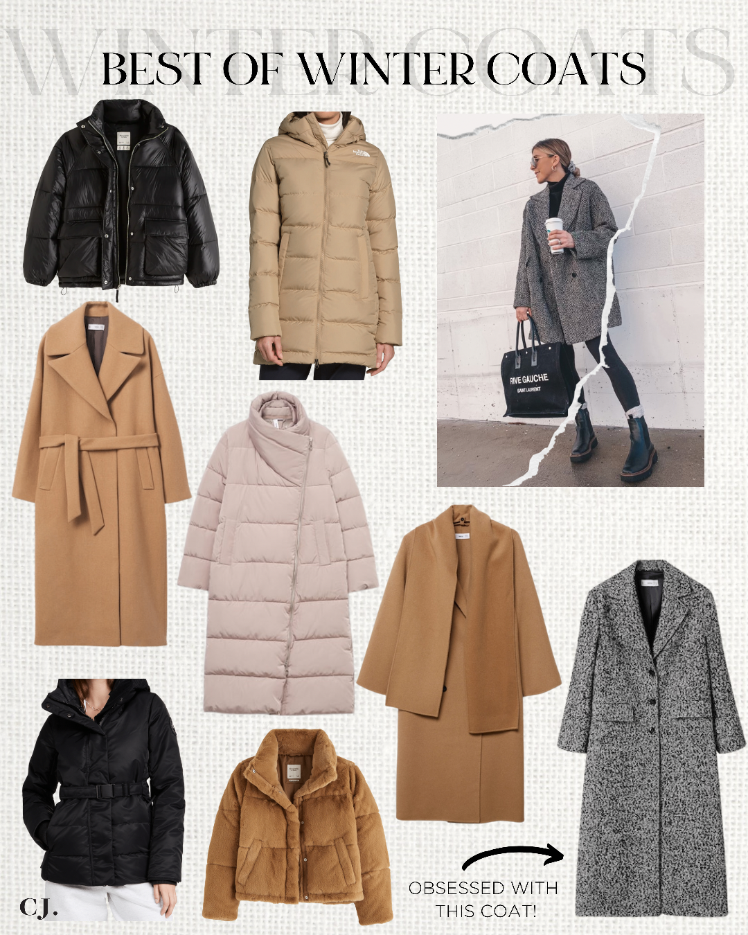 Black cropped puffer // Tan NorthFace // Camel belted coat // Beige puffer parka // Black belted puffer // Brown cropped // Camel with scarf // Herringbone double breasted // Flecked wool coat