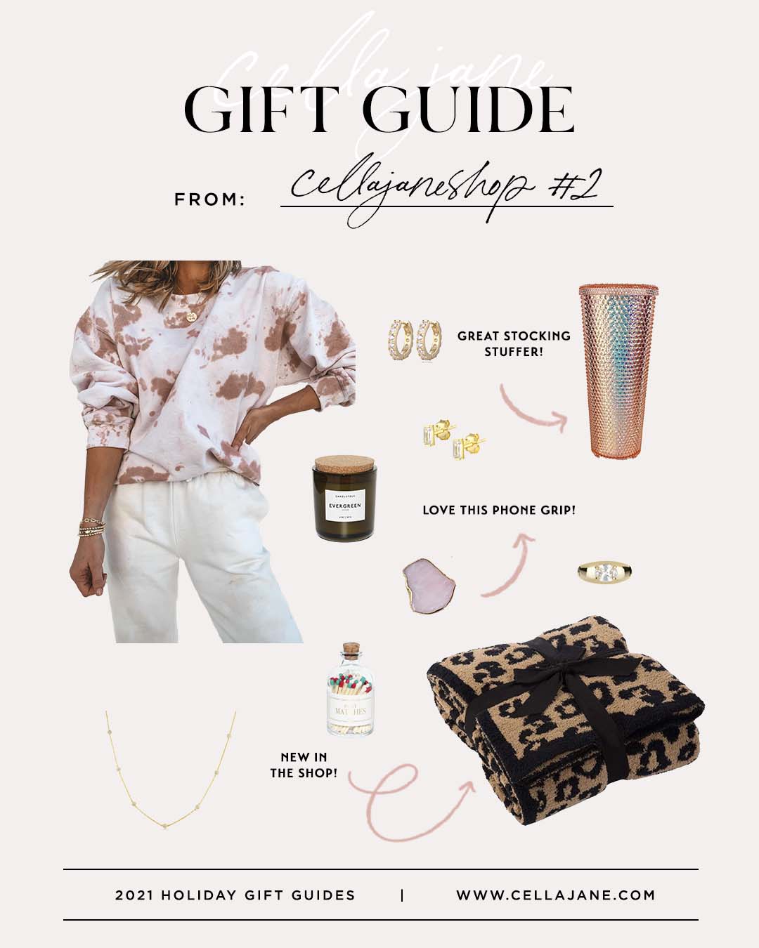 Tie Dye Sweatshirt // Jade huggies // Tumbler // Beverly Baguette Studs // Evergreen Candle // Phone Grip // Zoey Ring // Beaded Pave Necklace // Apothecary Matches // Blanket