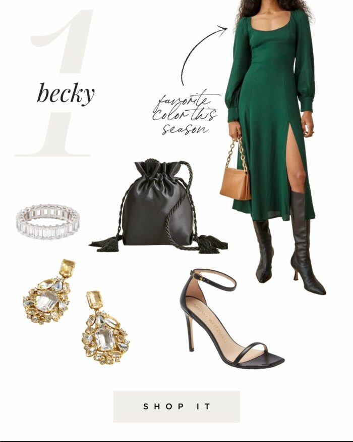 For this year’s photo, I wanted rich gem tones to be the color palette against the beautiful downtown Kansas City hotel backdrop. I’ve been loving the evergreen color that’s currently on trend for holiday, and found a gorgeous dress from Reformation to fit my vision.