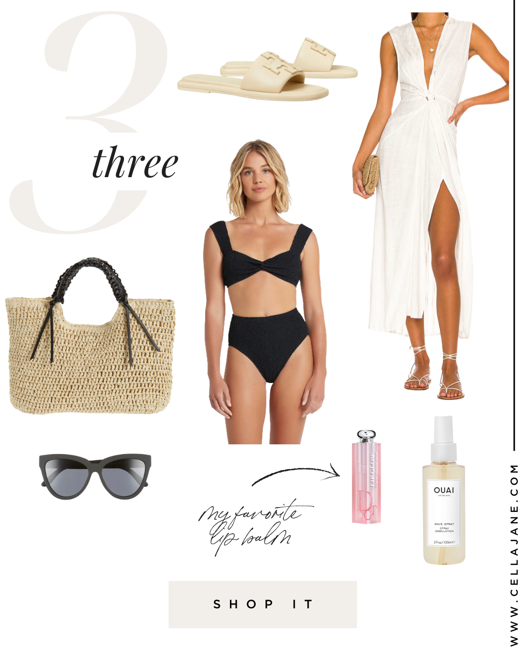 Three: Swimsuit Top // Swimsuit Bottoms // Cover Up // Sandals // Tote // Sunglasses // Lip Balm // Wave Spray