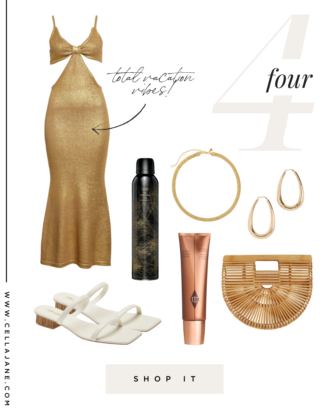 Four: Dress // Sandals // Necklace // Earrings // Tote // Body Lotion // Texturizing Spray