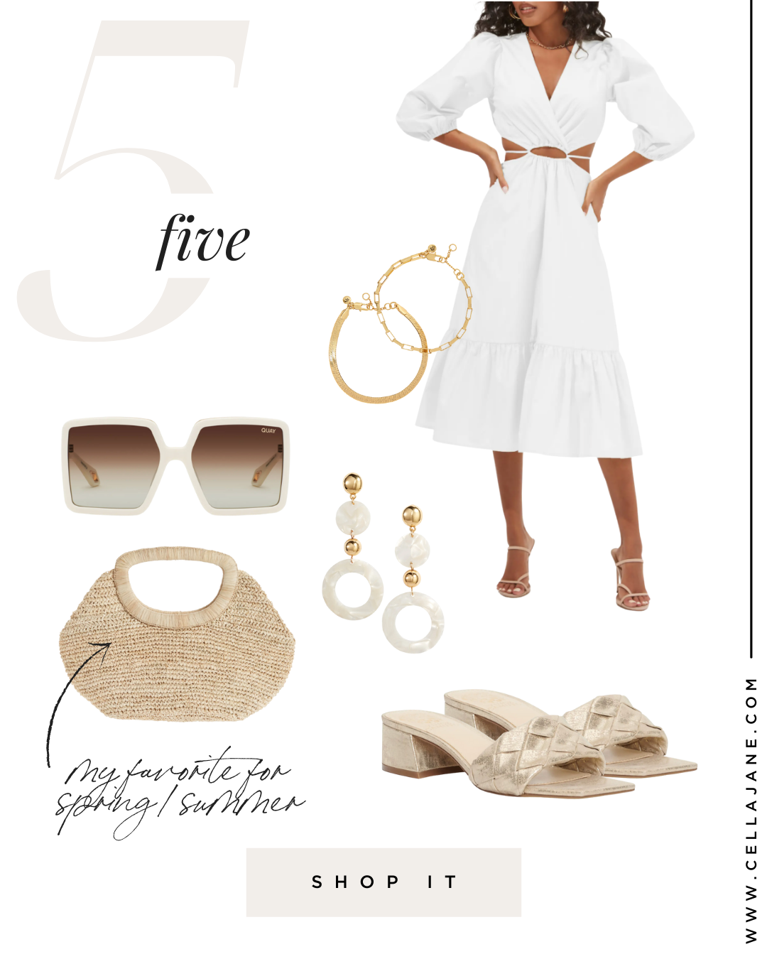 Five: Dress // Sandals // Tote // Earrings // Bracelets // Sunglasses