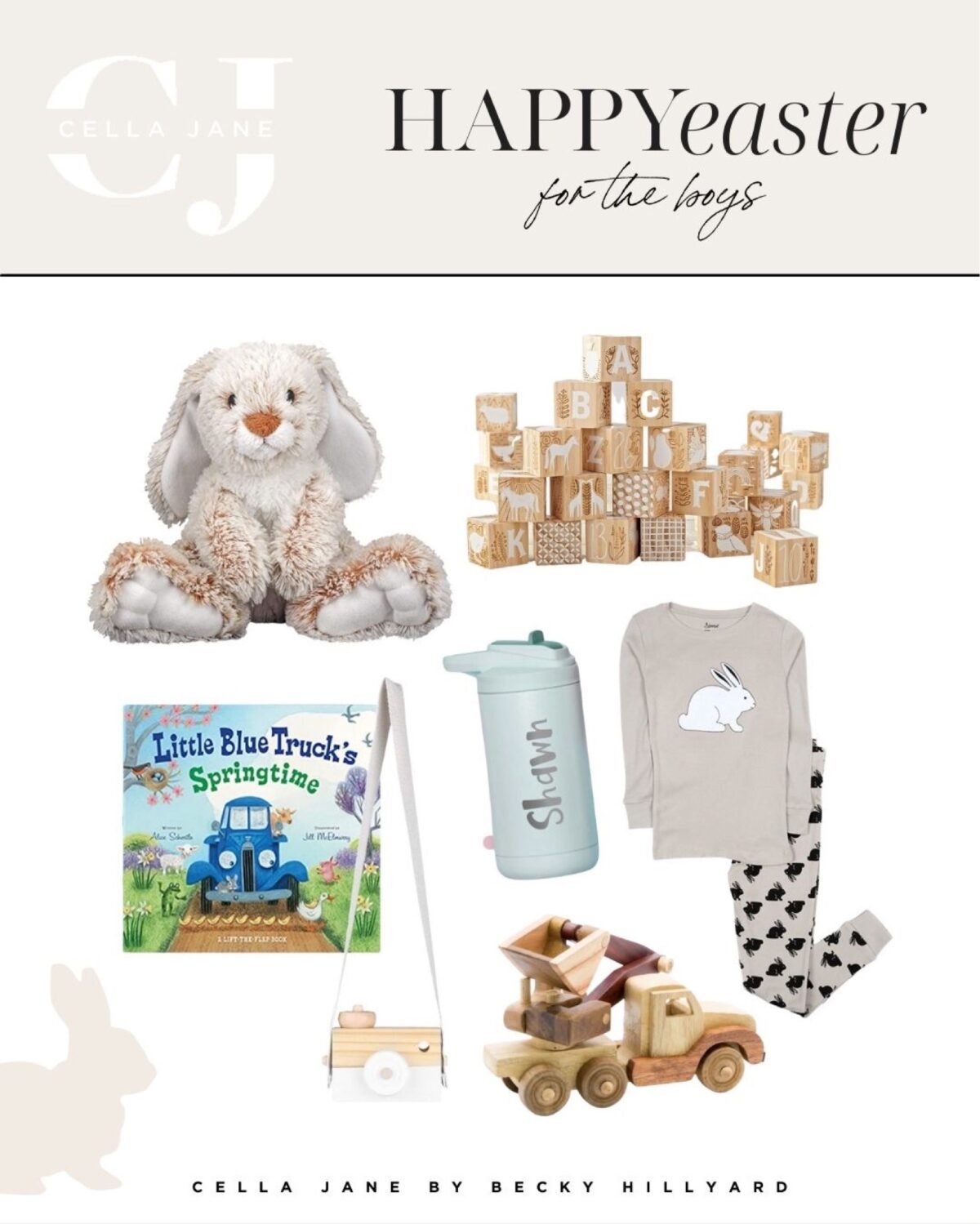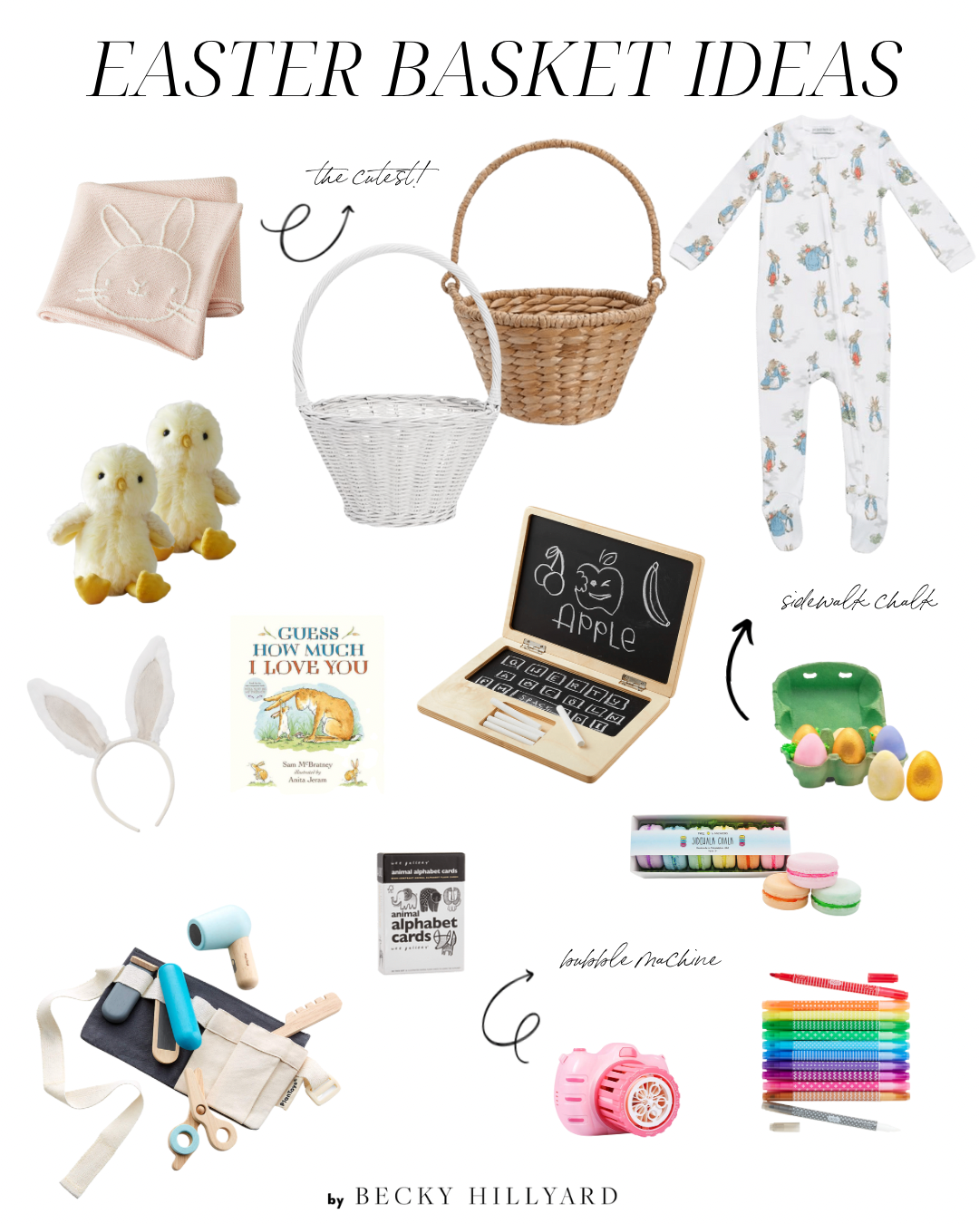 Blanket // Easter baskets // Onesie // Chicks // Headbands // Book // Laptop chalkboard // Egg chalk // Hair dresser kit // Alphabet cards // Bubble machine // Macaroon chalk // Markers