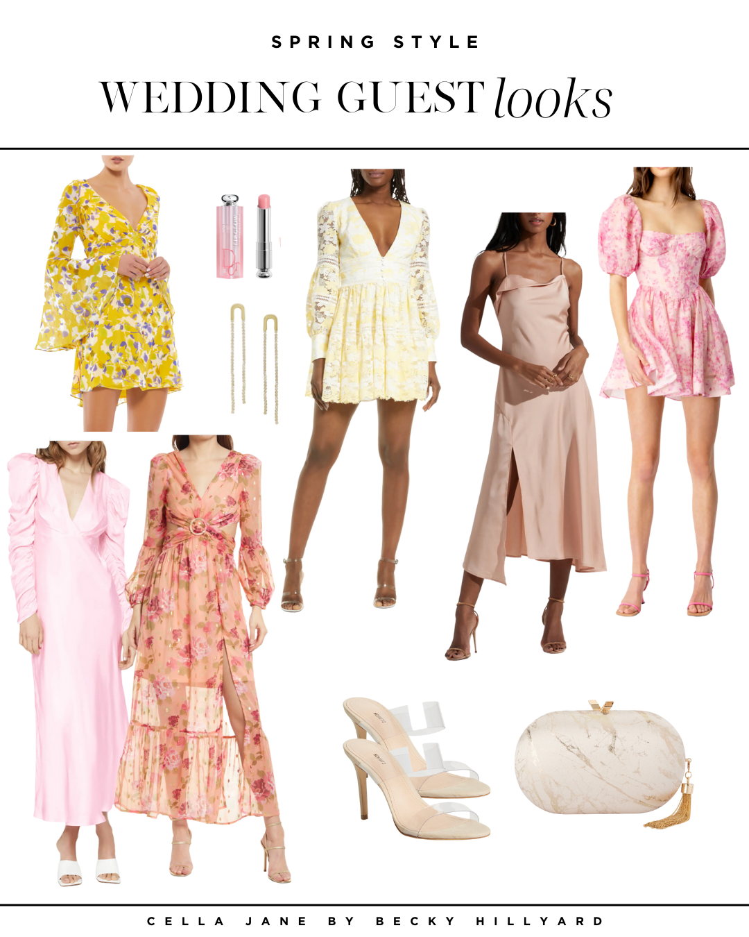 Bright yellow dress // Lip balm // Earrings // Pale yellow dress // Champagne dress // Floral pink mini dress // Long sleeve pink dress // Long sleeve floral dress // Sandals // Clutch