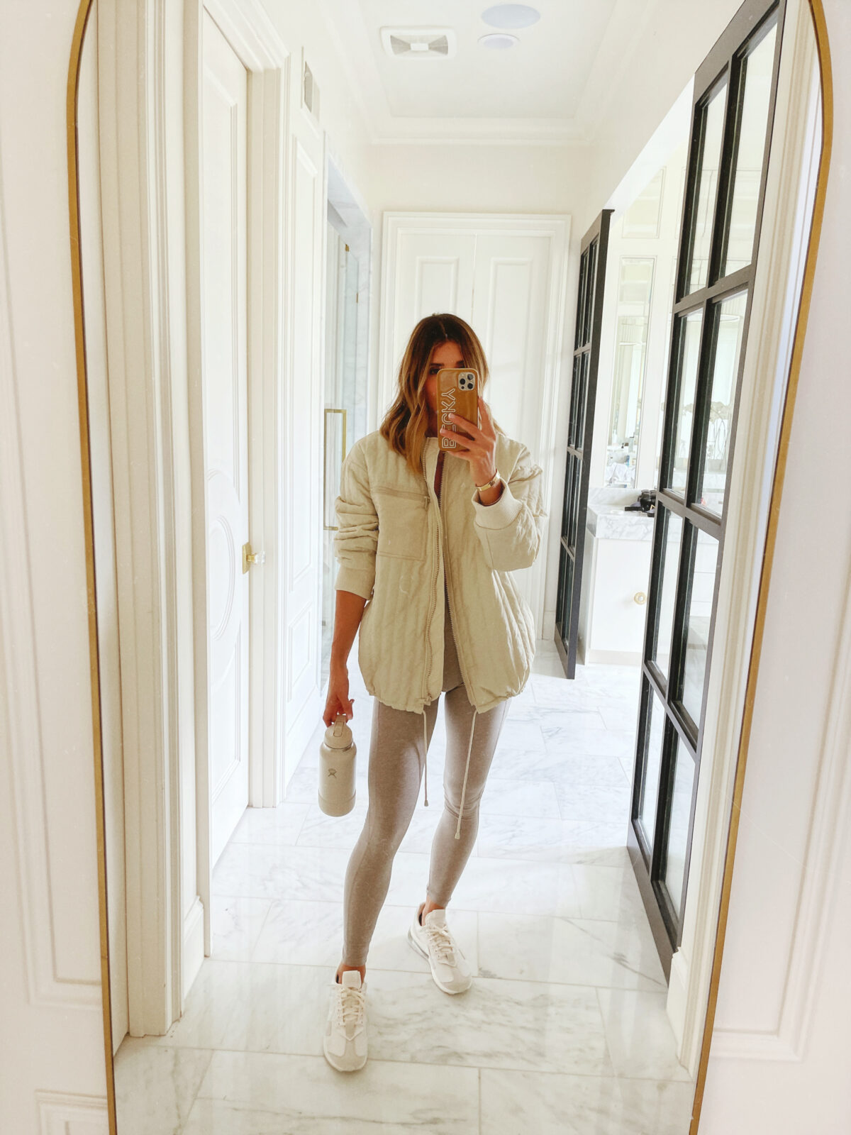 PUFFER JACKET // SWEATER JACKET // SPORTS BRA // LEGGINGS // SNEAKERS // WATER BOTTLE