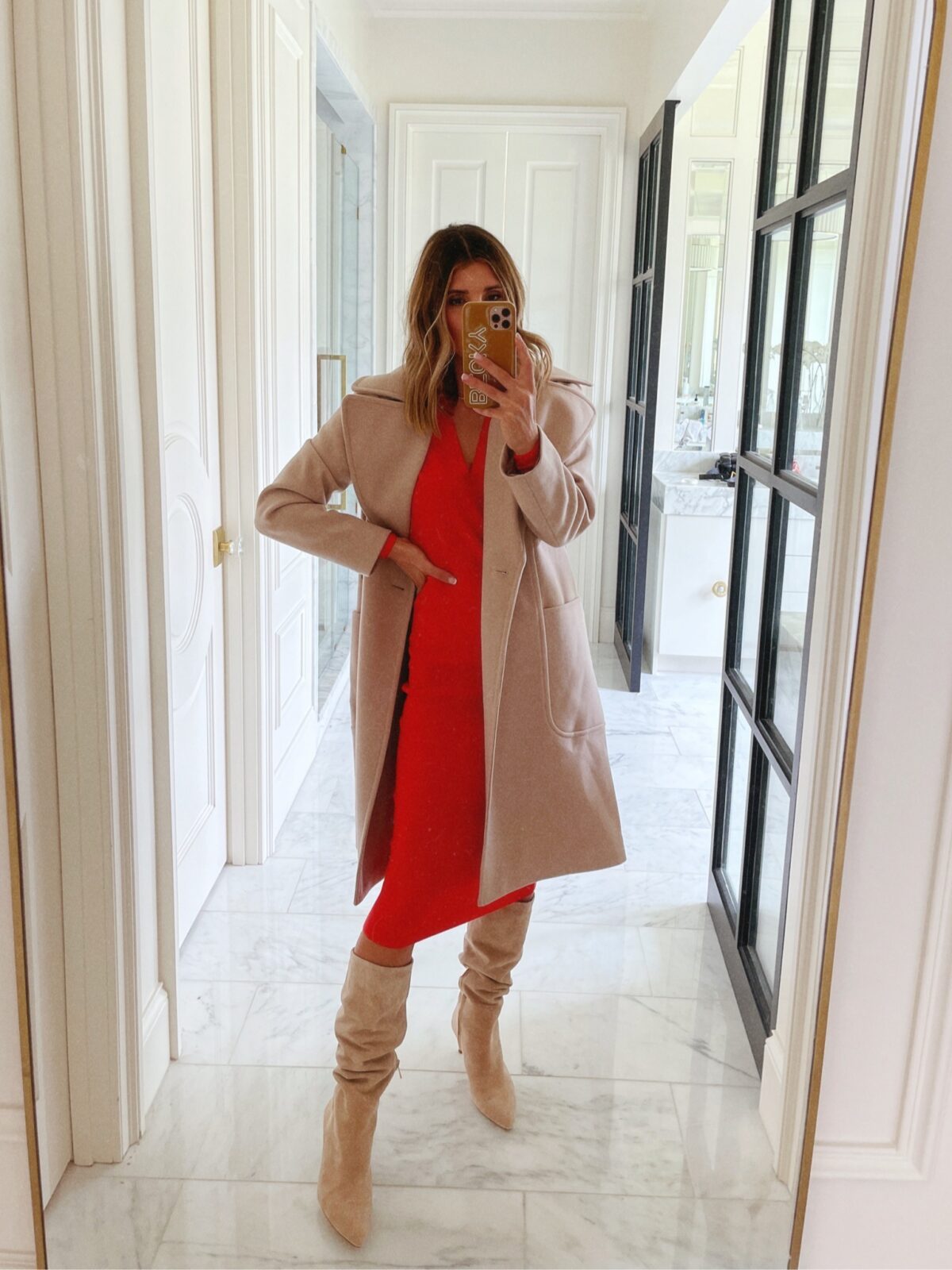 REVIEW: This sweater dress is so so comfy, the fit is so flattering too! I typically don’t wear a lot of color but this red is so beautiful, definitely think I will keep this dress for a Christmas or Holiday party! Also love this double breasted coat, It falls at the perfect length too! I definitely recommend both these heels and boots! Great closet staples!