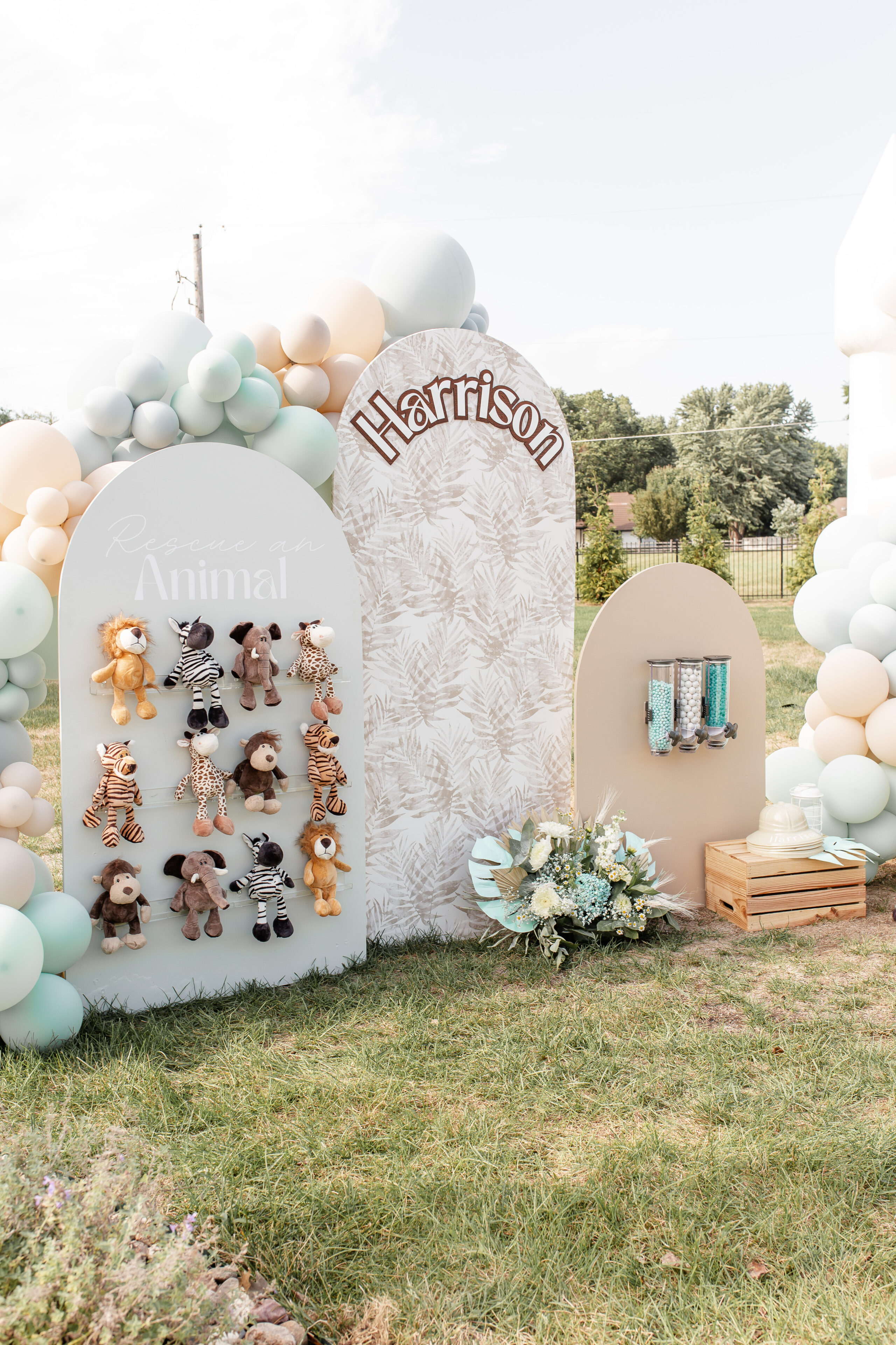 I am so lucky to be able to work with some stellar local vendors that went above and beyond to make this party super special for Harrison and our family. We worked with a new KC vendor The Party Trend for the event styling and rentals like the ball pit and bounce house. Their team was amazing to work with, and I cannot wait to work with them again for future parties. Jubilee Balloon Co created the amazing balloon arch and Pink Antlers and Evoke Happy provided the paper goods and signage. We had family and friends attending the party, so I was really excited to work with Spritz Co. again for some fun alcoholic and non-alcoholic party drinks! Harrison loved the Swamp Water: sprite and lime sherbet and of course we had a fan favorite, spicy margaritas! Once again, Grazing KC made a beautiful charcuterie board, and Midwest Cookie Co and Taylor Elizabeth Cakes created gorgeous, sweet artistry in cookies, cake and macaroons. The gorgeous themed florals and arches were masterpieces by Wallflower KC.
