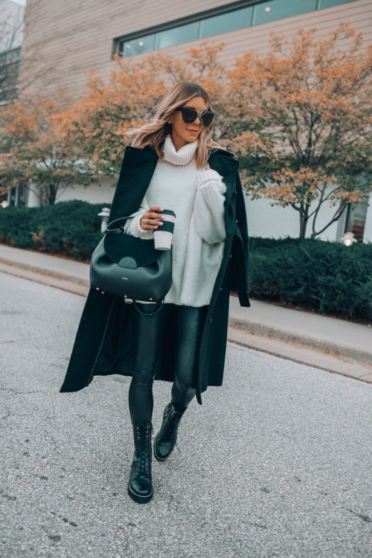 Black Coat // White Turtleneck // Vegan Leather Leggings // Combat Boots // Sunglasses // Bag (similar)