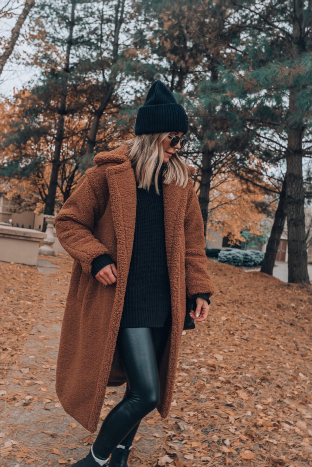 Teddy Coat // Turtleneck Sweater // Vegan Leather Leggings // Chelsea Boots // Beanie // Sunglasses