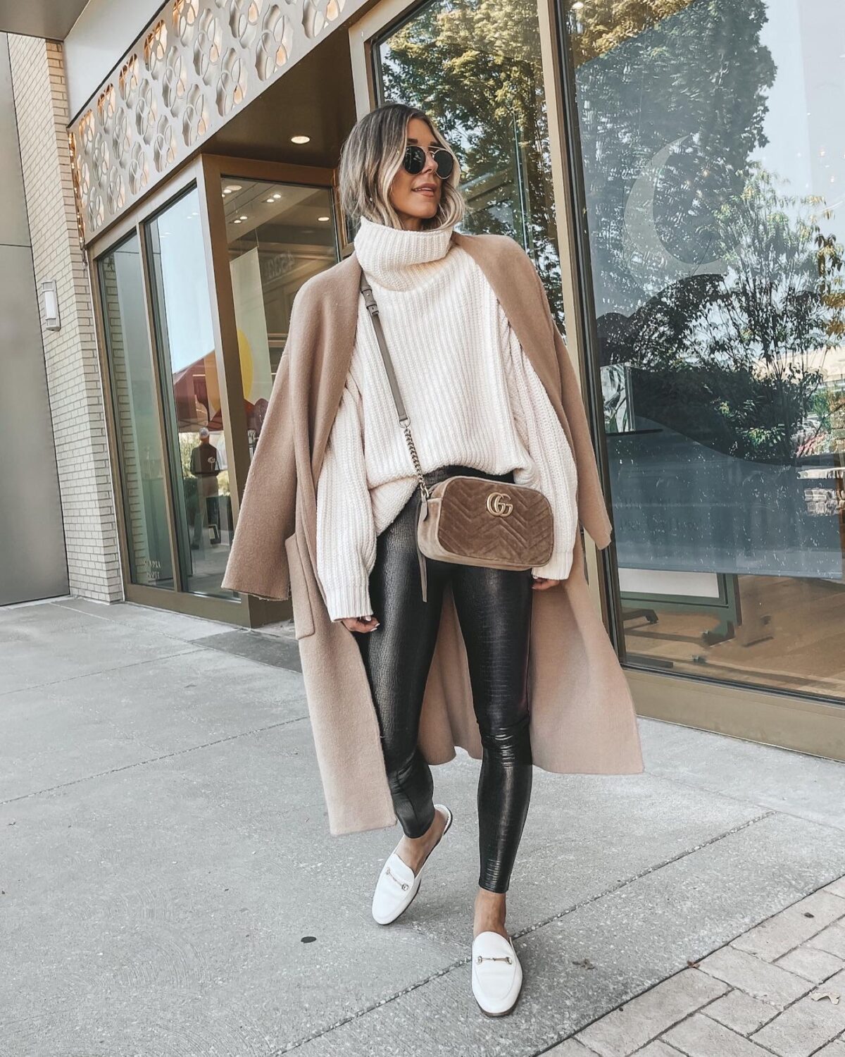 Camel Coatigan // Turtleneck Sweater // Vegan Leather Leggings // Mules // Handbag (similar) // Sunglasses
