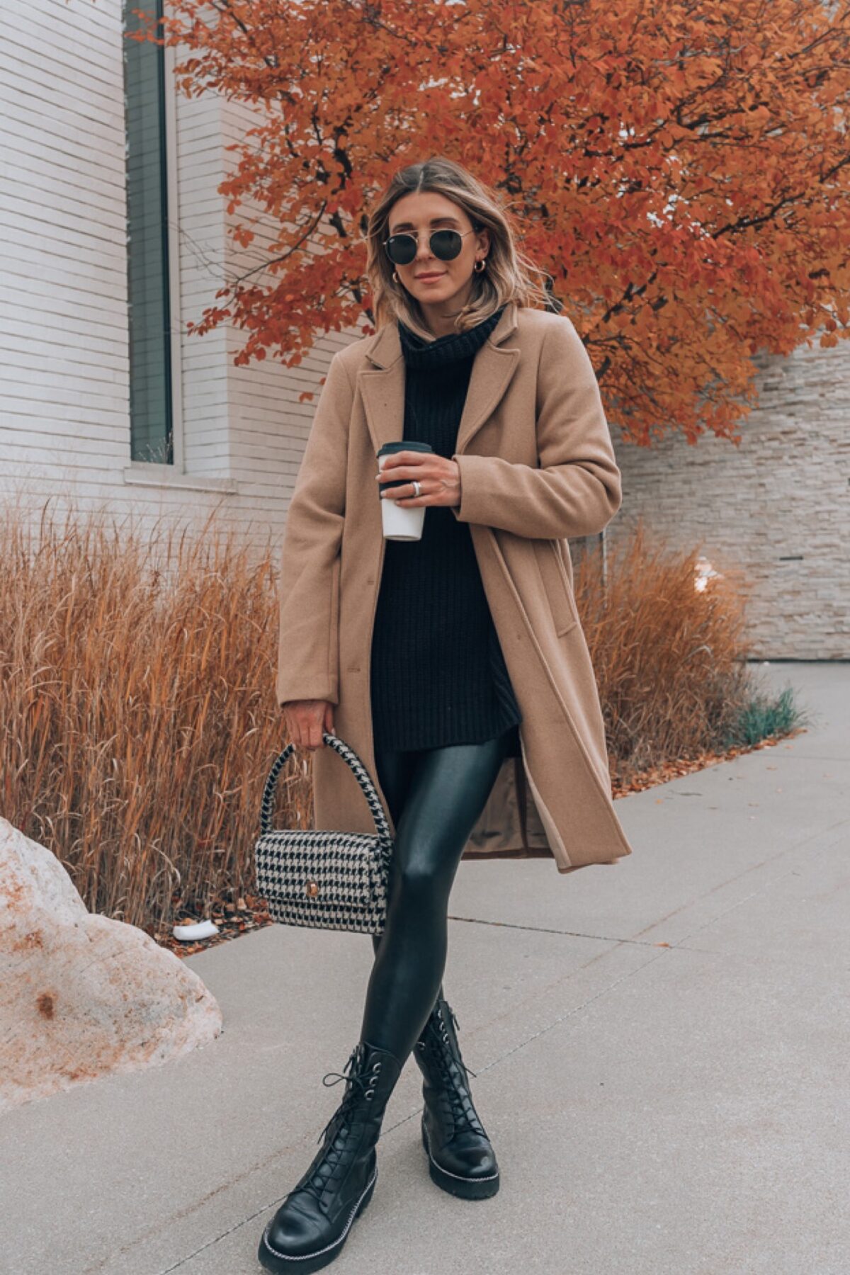 Camel Coat // Turtleneck Sweater // Vegan Leather Leggings // Combat Boots // Houndstooth Bag // Sunglasses