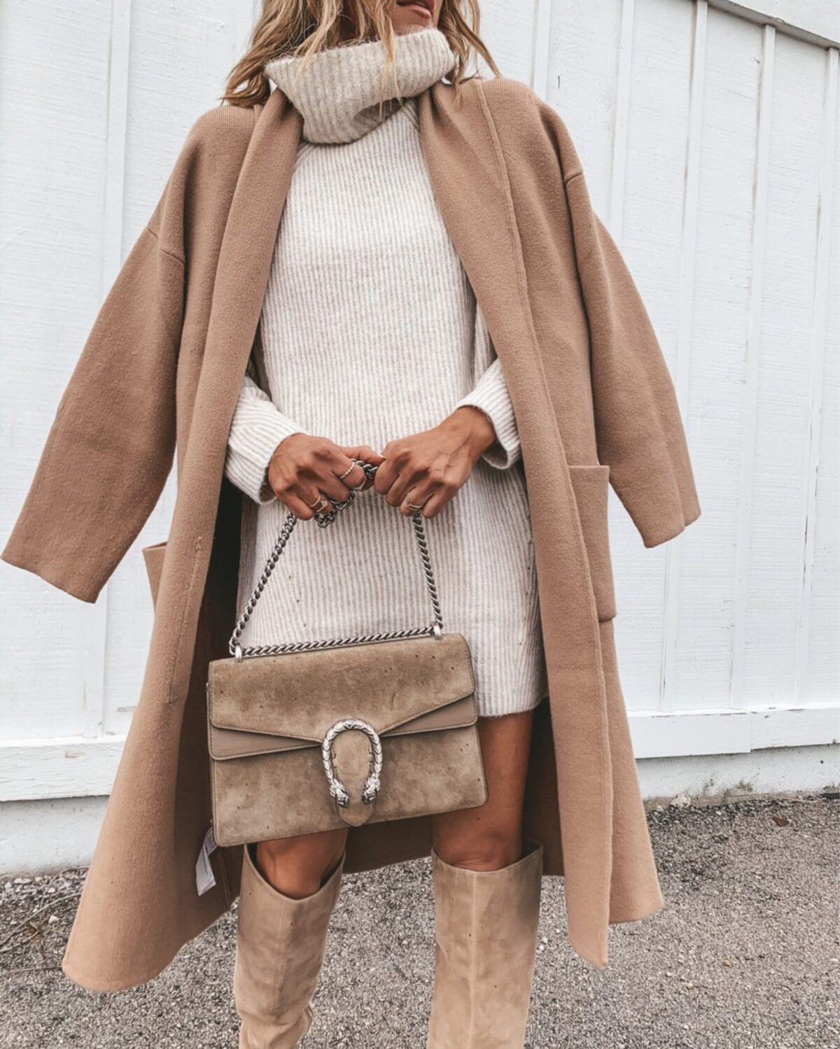 Camel Coatigan // Sweater Dress // Knee High Boots (similar) // Handbag