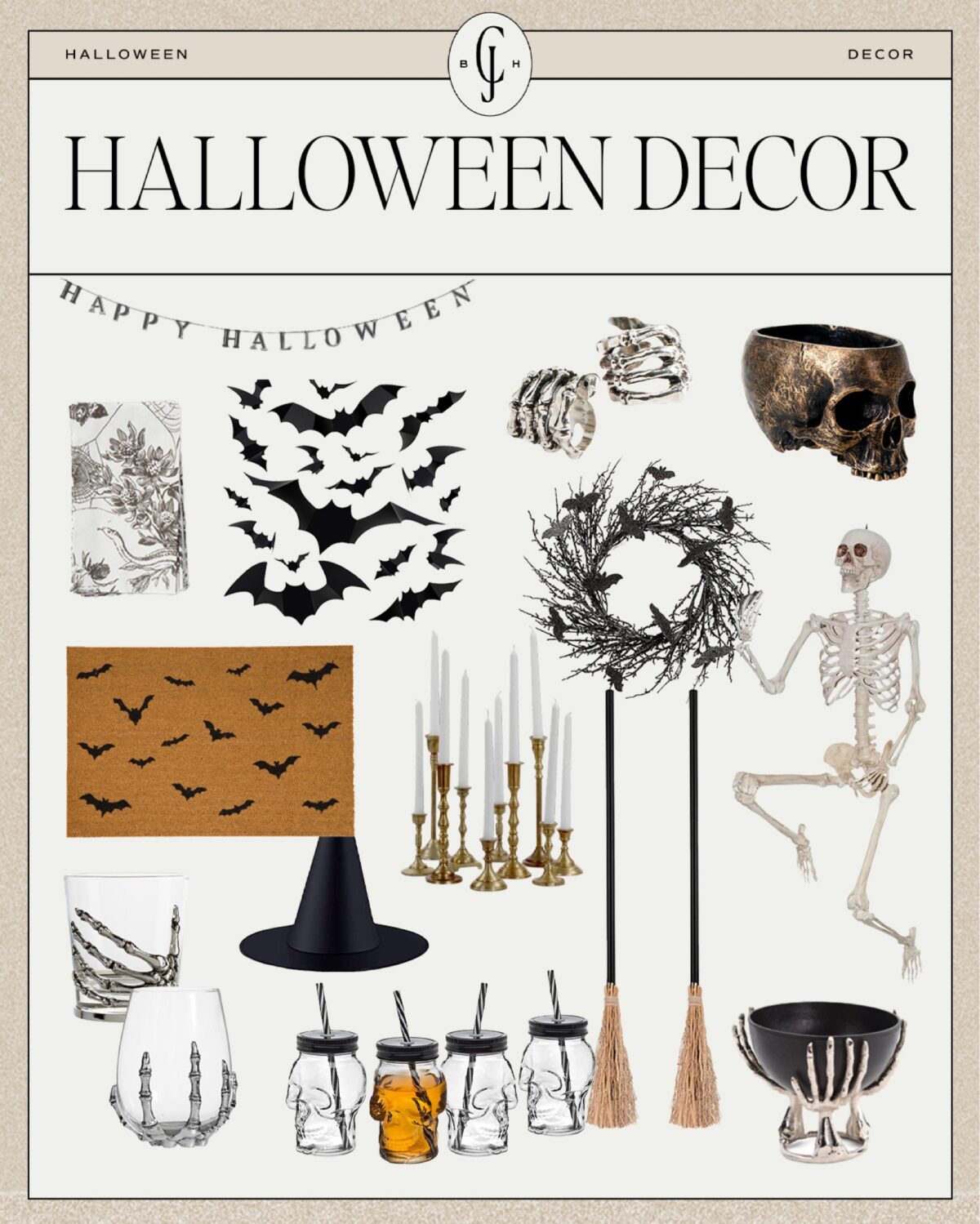 Halloween Banner // Guest Napkins // Decorative Bats // Skeleton Napkin Holders // Skull Candy Dish // Bat Wreath // Bat Doormat // Witch Hats // Candlesticks // Witch Broom // Decorative Skeleton // Skeleton Tumbler // Skeleton Wine Glass // Skull Cups // Skeleton Hand Dish