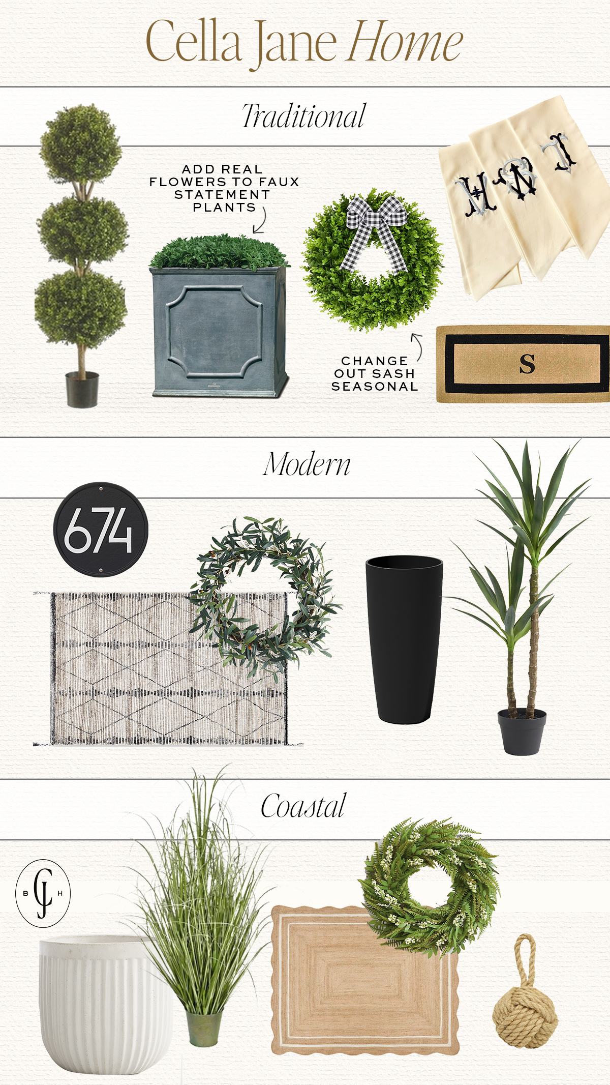 wreath – similar here / sash – similar here / large square planter / mat / boxwood / brass knocker