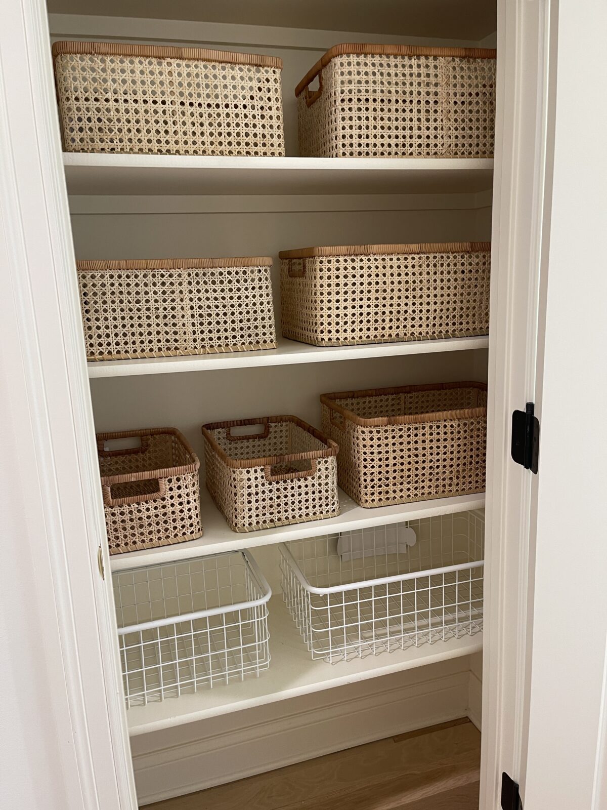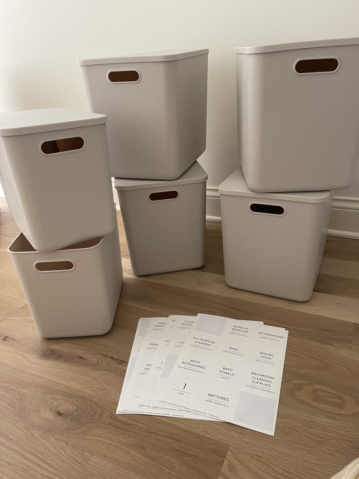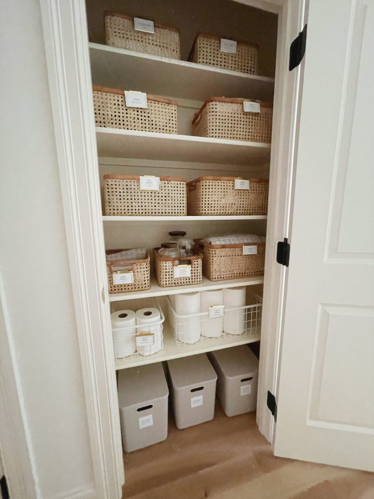 3. Select tools based on needs. – Sorting into piles gives you a good idea of the type and size or organization container you will need. For things frequently used, like toilet paper and paper towels, I selected these wire baskets. These rattan baskets I used for hand towels and blankets are not only pretty, but also functional in storing and available in different sizes. For misc items that are larger and not used as frequently, I used these larger bins with lids. Gold bin clips and pre-printed labels finished off the bins.