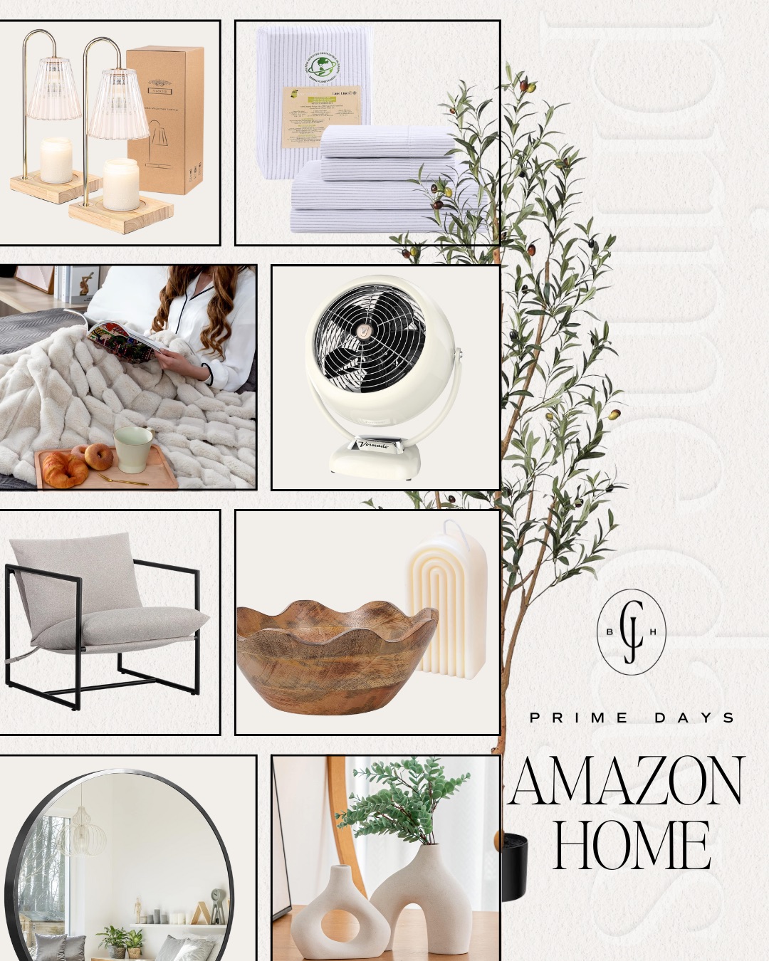 Ceramic Vase Set / Faux Fur Throw / Vintage Fan / Candle Warmer / Organic Cotton Sheets / Artificial Olive Tree / Sling Accent Chair / Round Mirror / Wooden Scalloped Bowl / Arch Shaped Candle