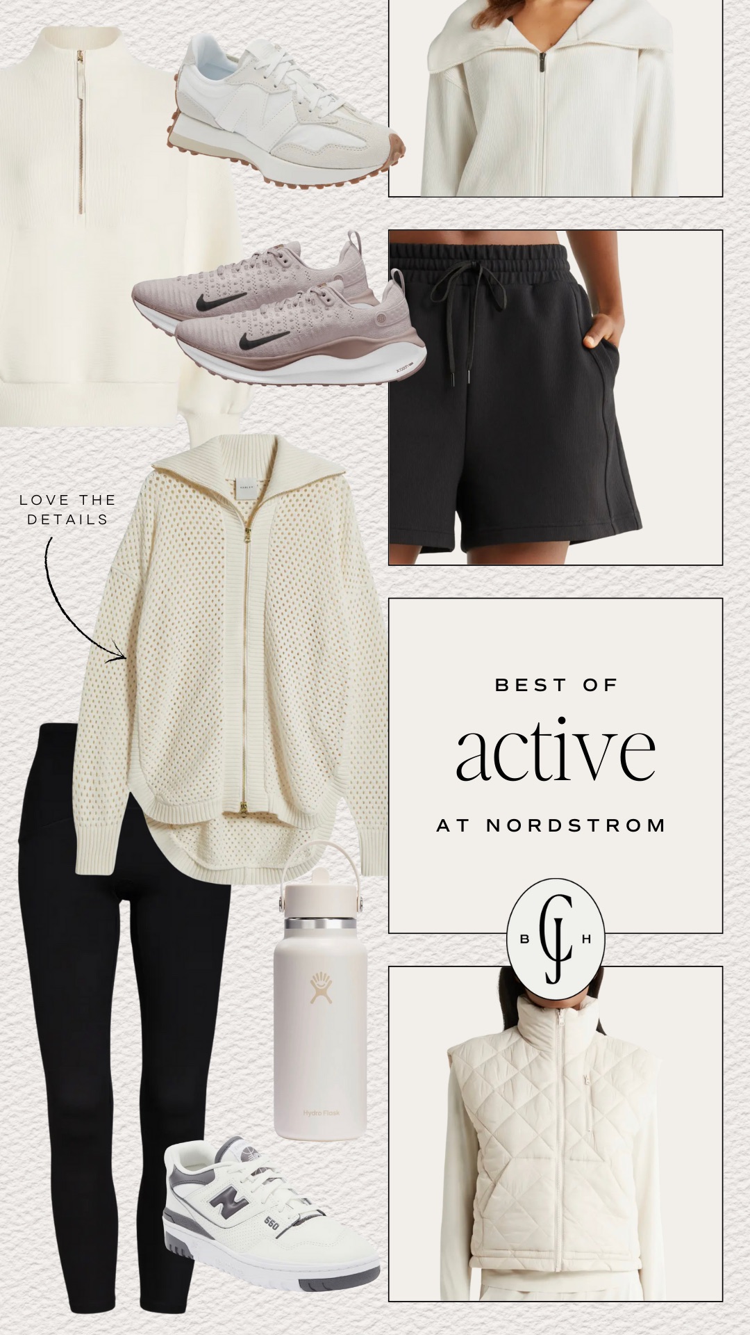 Spans Booty Boost Leggings / Nike running shoe / Varley Knit Jacket / Zella Zip Jacket / Hydroflask / New Balance 327 Sneakers / Varley Half Zip / Zella drawstring shorts / Zella Cropped Puffer Vest / New balance sneakers