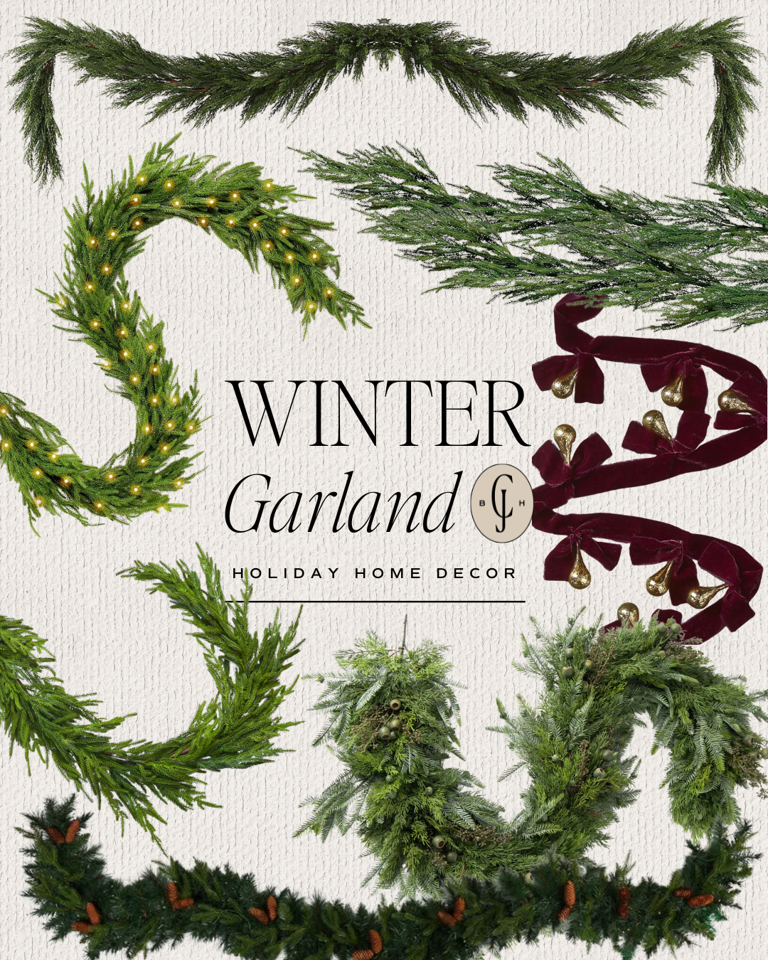 Norfolk Garland // Winter’s Bounty // Real Touch Pine // Pre-Lit Garland // Dripping Garland // Cypress Garland // Velvet Garland // Pinecone Garland