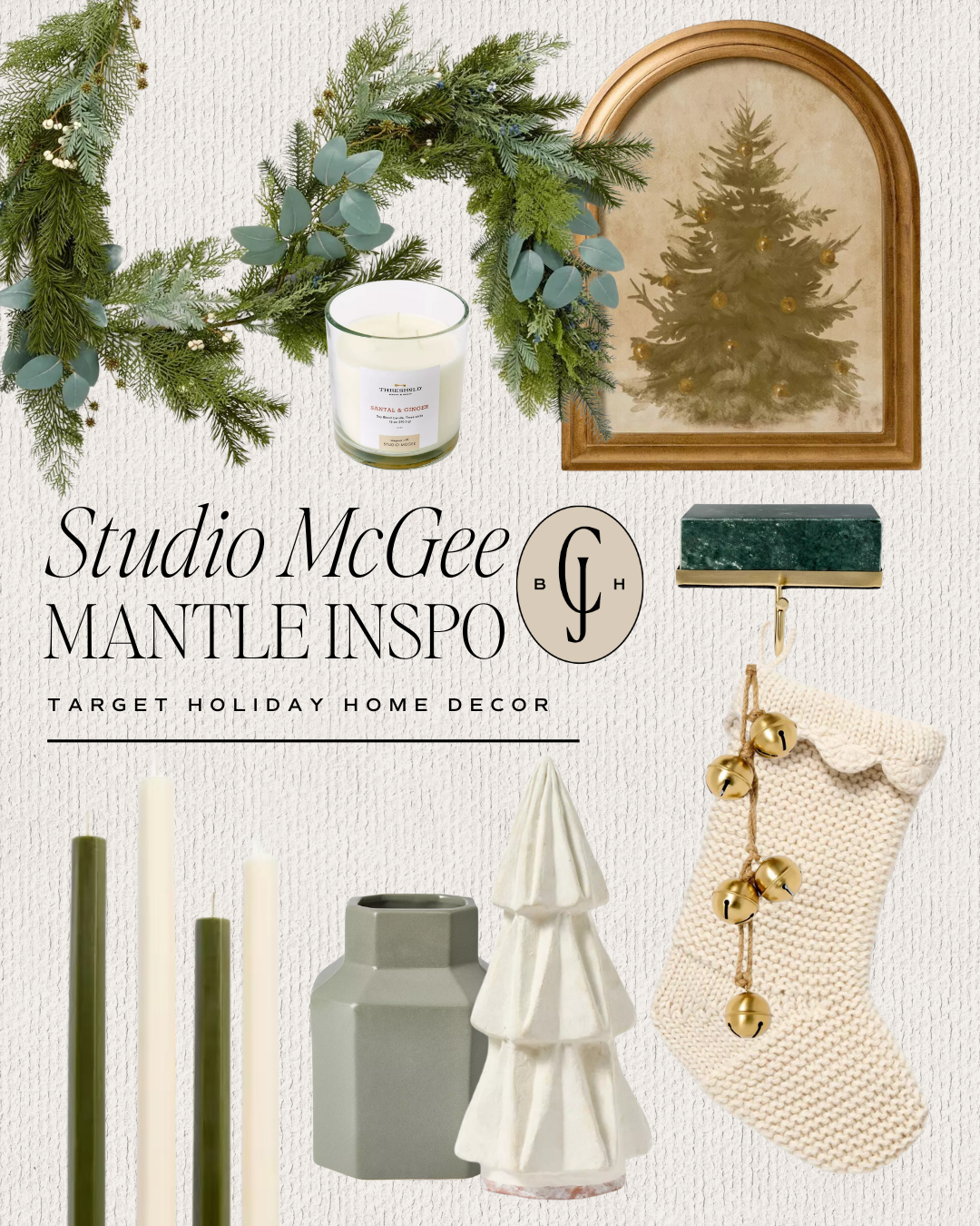 Stocking // Stocking Holder // Garland // Ceramic Tree // Candle // Tree Wall Art // Tapered Candles // Ceramic Vase // Hanging Bells