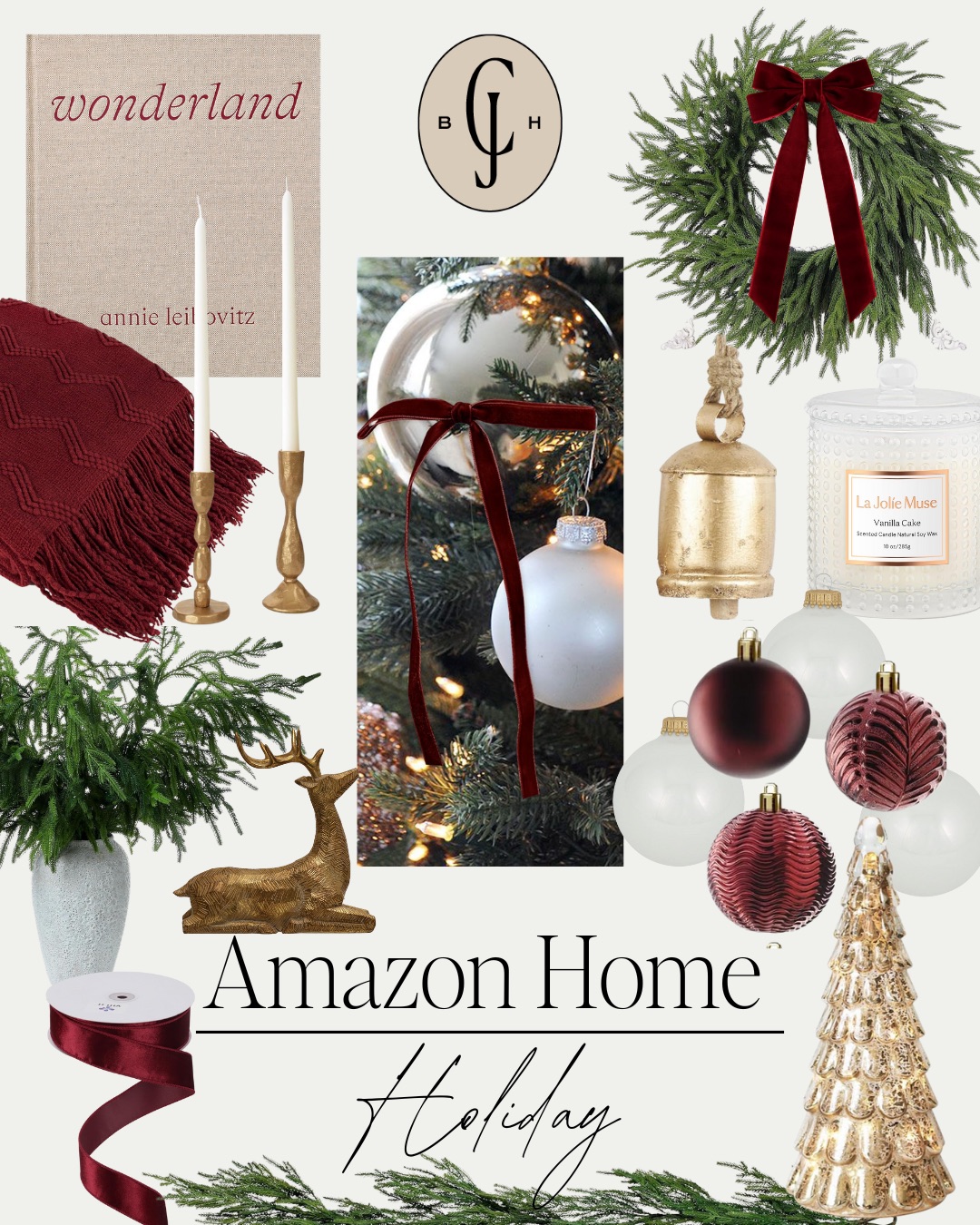 White Ornaments // Decorative Bells // Pine Garland // Throw Blanket // Gold Deer // Velvet Bows // Pine Branches // Pine Wreath // Red Ornaments // Burgundy Ribbon // Candlesticks // Wonderland // Canvas