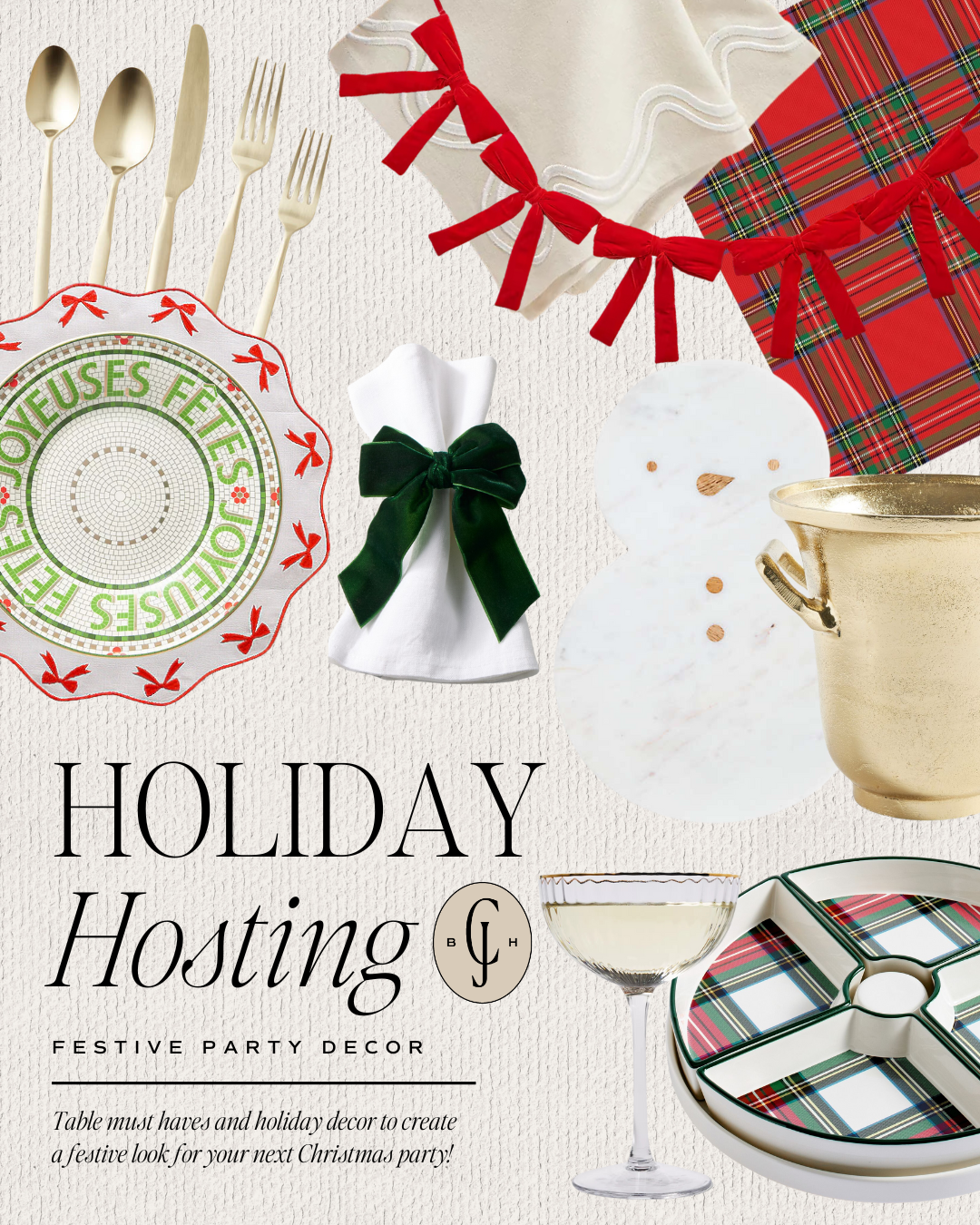 Snowman Trivet // Gold Flatware // Bow Placemat // Festive Plate // Tartan Napkins // Plaid Lazy Susan // Madeline Napkins // Ice Bucket // Coupe Glasses // Bow Garland // Napkin Rings