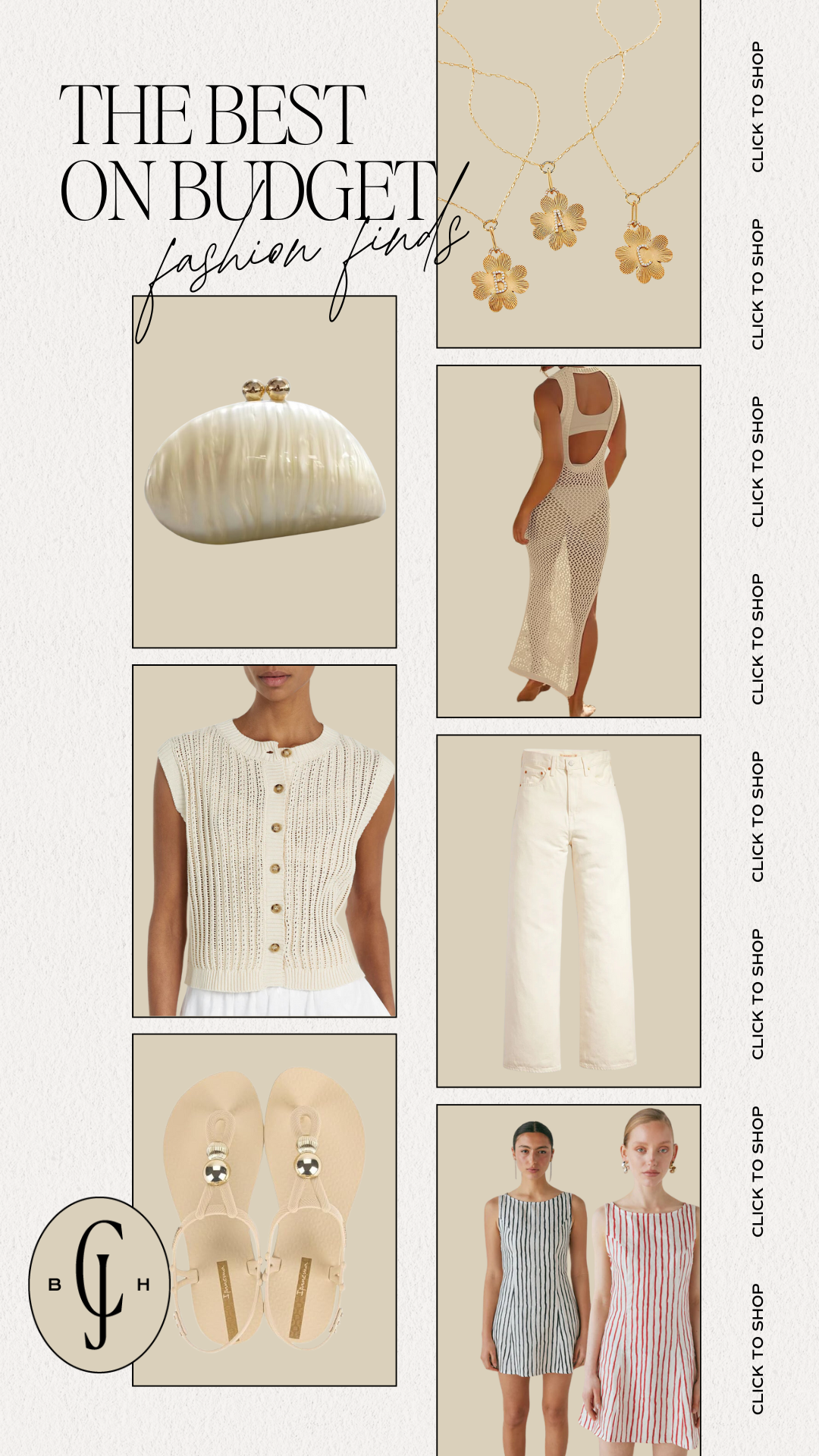 SHELL CLUTCH ($27.98) // CROCHET VEST ($39.00) // SANDALS ($35.00) // MONOGRAM NECKLACE ($48.00) // CROCHET COVER UP ($29.99) // LEVI’S JEANS ($98.00) // LINEN MINI DRESS ($64.00)