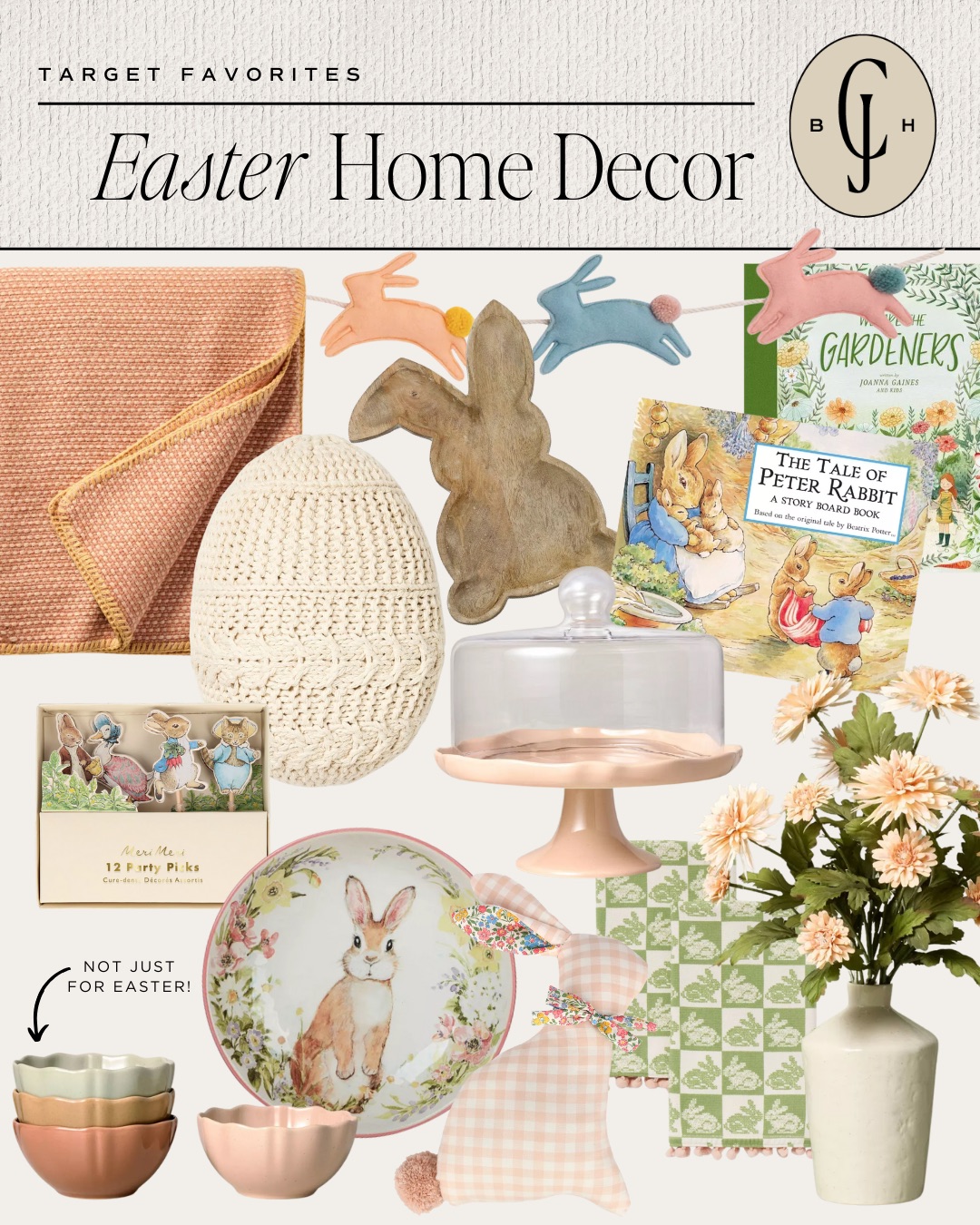 Throw Blanket // Dessert Stand // Hand Towels // Flower Arrangement // Dessert Bowls // Bunny Garland // Serving Tray // Dining Plates // Peter Rabbit Party Picks // Bunny Cushion // Gardners Book // Peter Rabbit Book // Crochet Throw Pillow