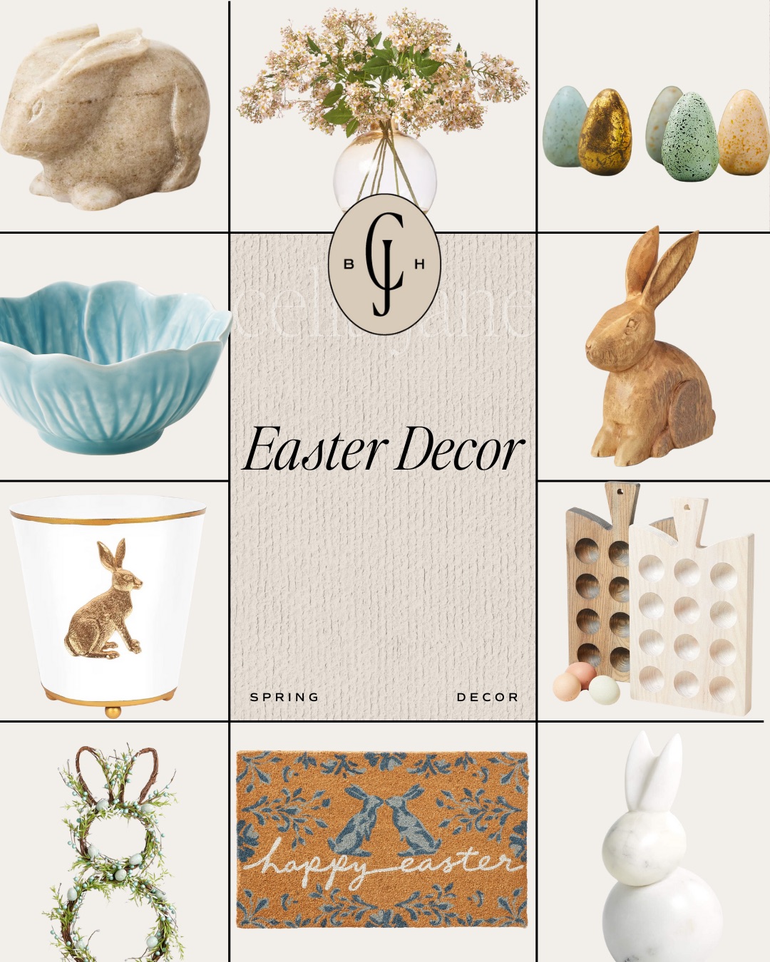Alabaster Eggs // Egg Holder // Golden Bunnies // Lilac Stems // Blossom Wreath // Spring Doormat // Faux Tulips // Marble Bunny // Blue Bowl