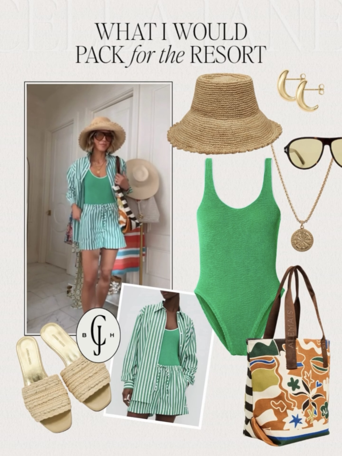 This striped set paired with a bright green suit is the perfect balance of playful and polished. I the fresh pop of color, while the easy layers and woven accessories keep everything relaxed and beach-ready.