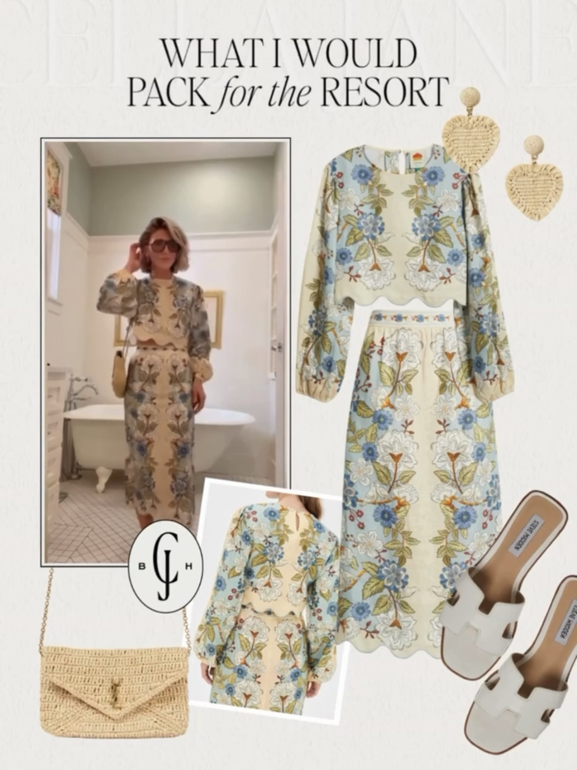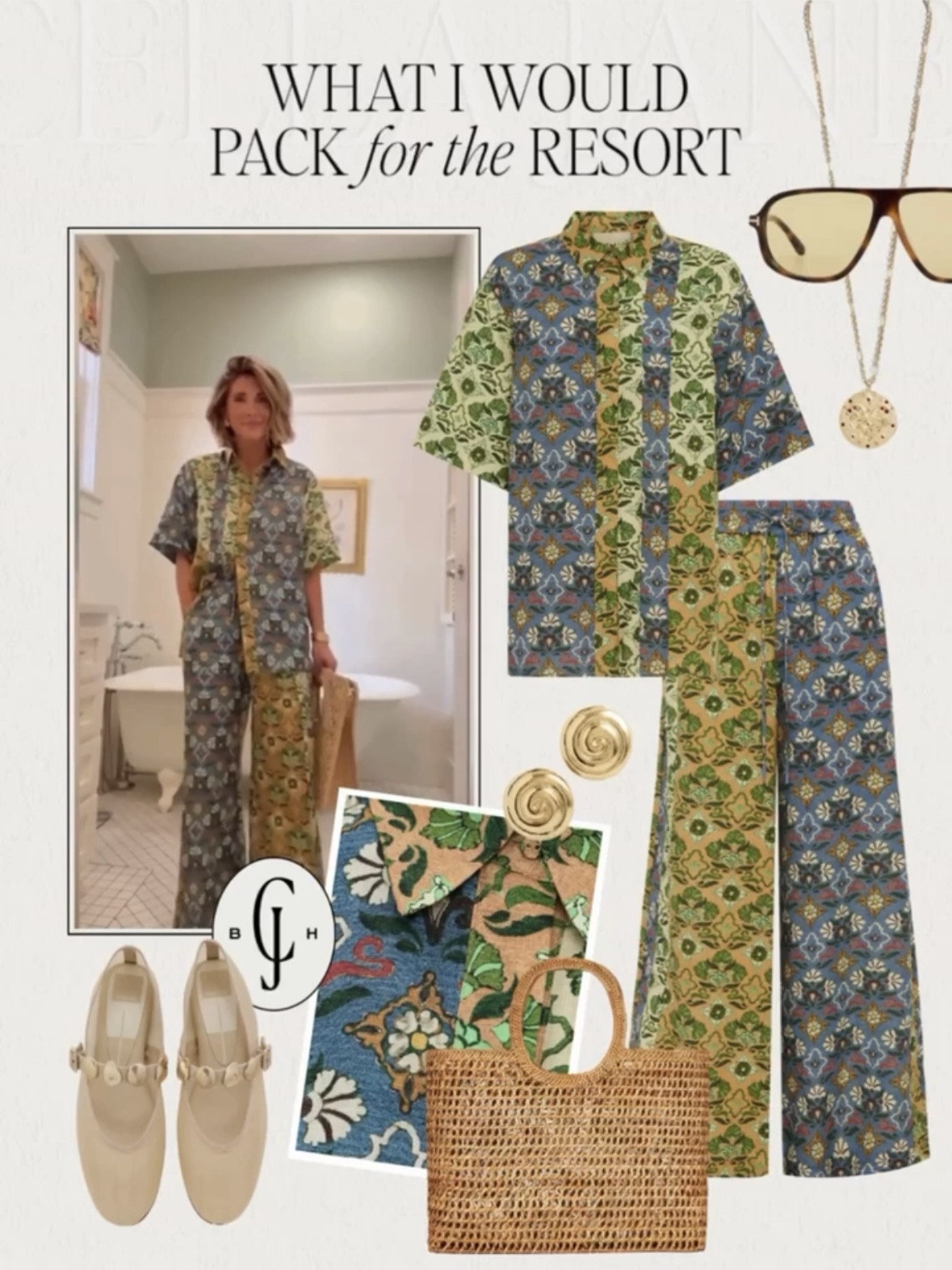 A patterned set like this is such an easy way to feel styled without overthinking it. The mix of prints gives it that effortless, globally inspired resort vibe, while the neutral accessories keep everything grounded.