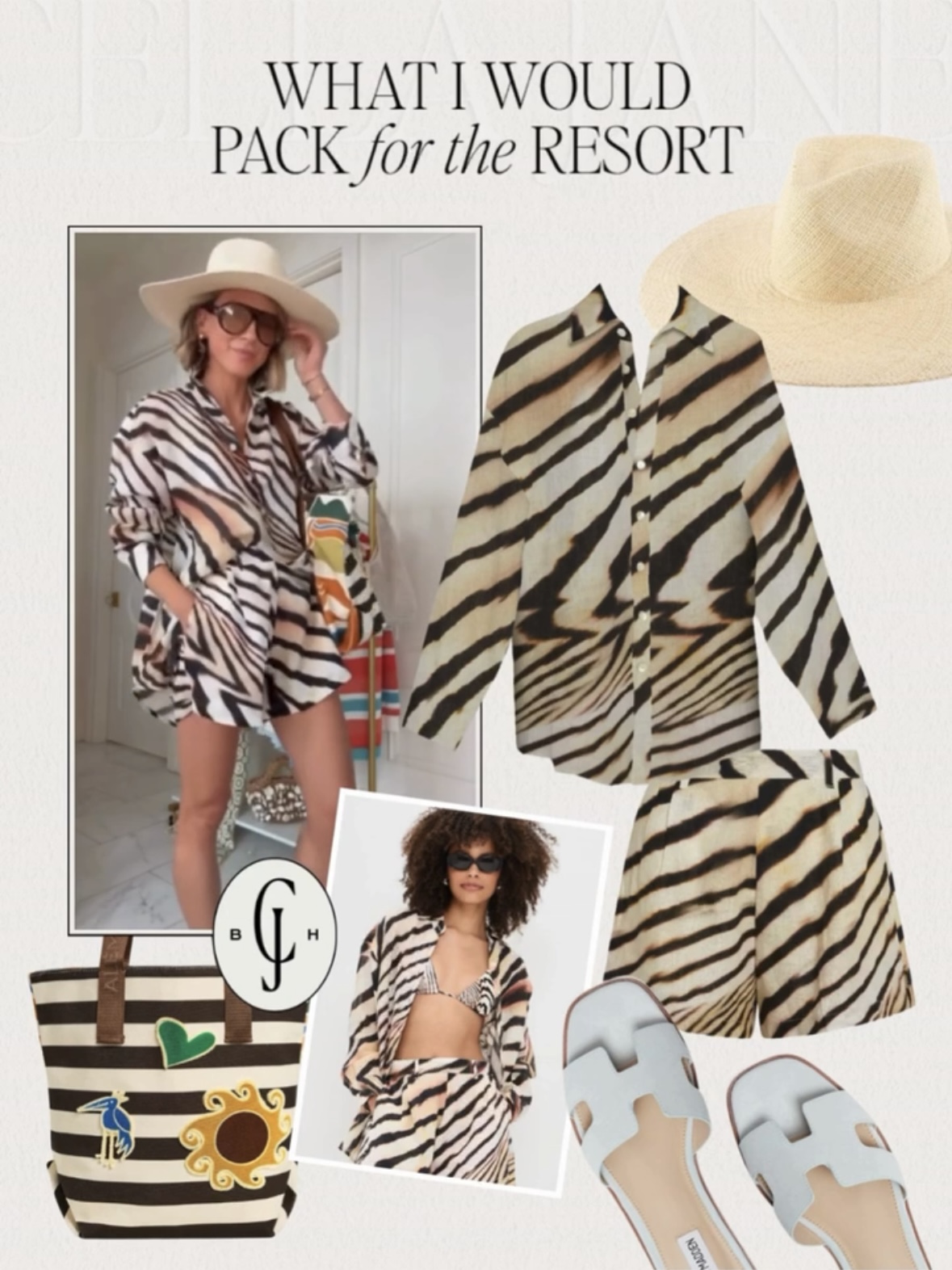 I always pack at least one bold set for resort trips, and this zebra-inspired print is such an effortless standout. The relaxed fit keeps it breezy for warm days, while neutral accessories and a wide-brim hat make the whole look feel intentionally styled.
