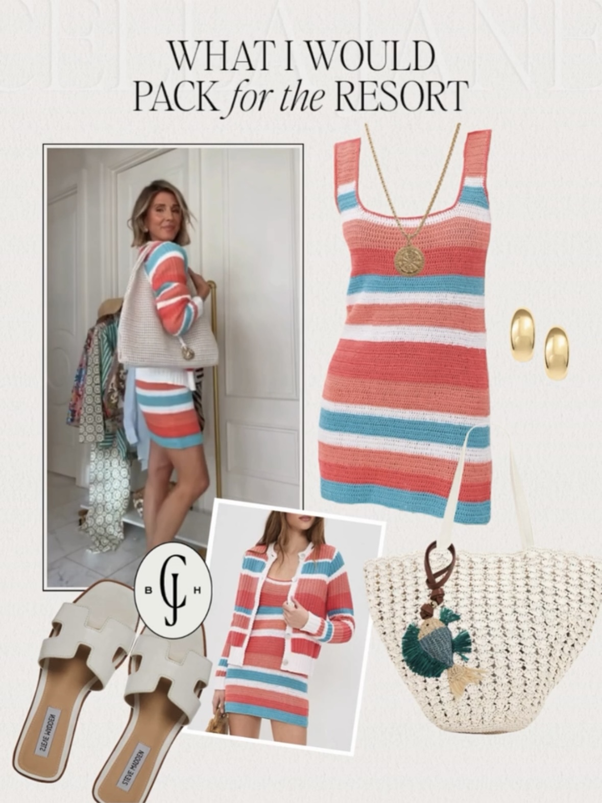 When it comes to beach and resort days, I love a mix of easy essentials and little style moments. On the beach, I’m all about pairing soft neutrals with a fun pattern—think a classic swimsuit topped with a printed sarong or a lightweight striped cover-up. It feels effortless but still elevated. And no matter how relaxed the day is, I always pack something a bit dressier for dinner. There’s nothing better than slipping into a flowy dress, sun-kissed skin, and simple gold jewelry after a day in the sand. Below, I’m sharing my must-have pieces and the outfits I’d bring for every moment of the getaway.