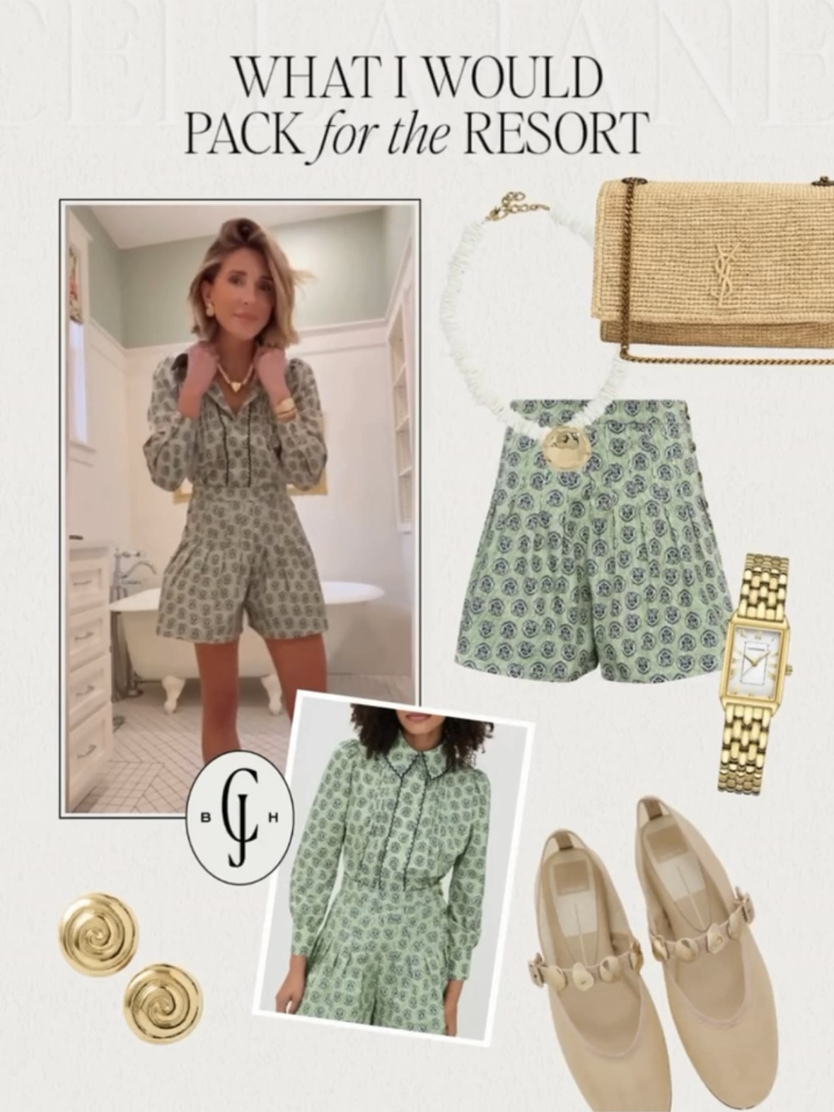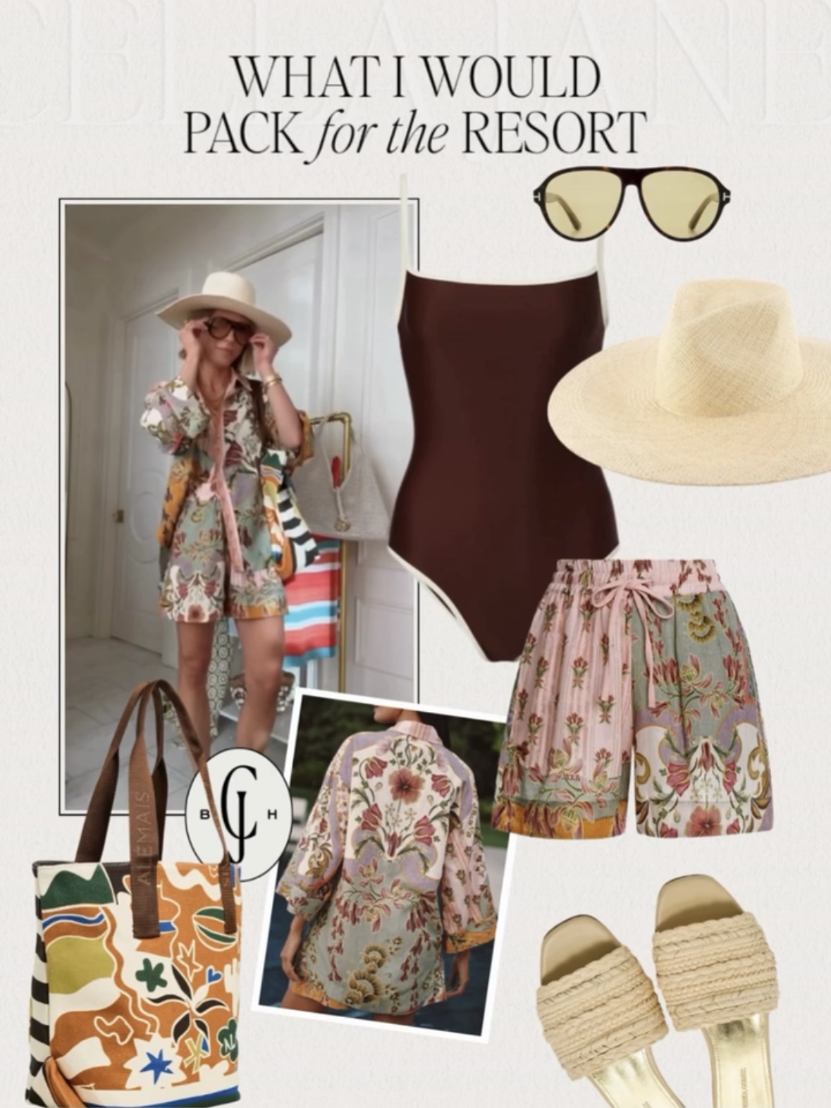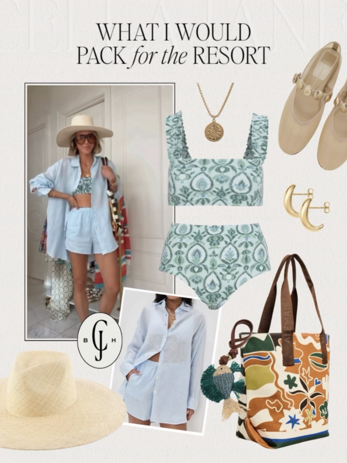 A crisp linen set is one of my favorite things to pack—it’s light, airy, and perfect for throwing on over a pretty printed suit. This look feels relaxed but intentional, with simple gold details and a woven hat to keep it effortlessly chic.
